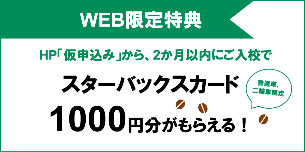 本ホームページの「資料請求・仮申込み」のフォームより仮申込みを行い、2ヶ月以内にご入校された方へ、スターバックスカード1,000円分をプレゼント!