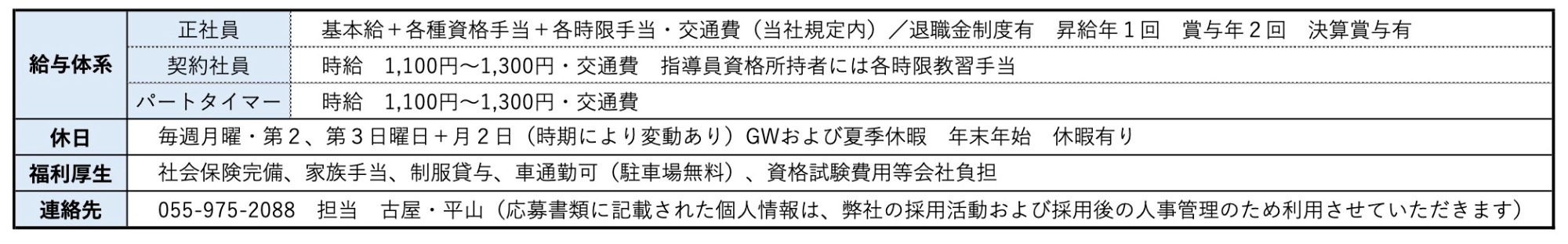 | 教習指導員を目指す方 (資格取得までサポートします) | 入社後、研修を受けながら、事務作業をして頂きます 普通免許MT所持者(AT限定免許の方は、入社後対応) 18歳以上 | 正社員 契約社員 |